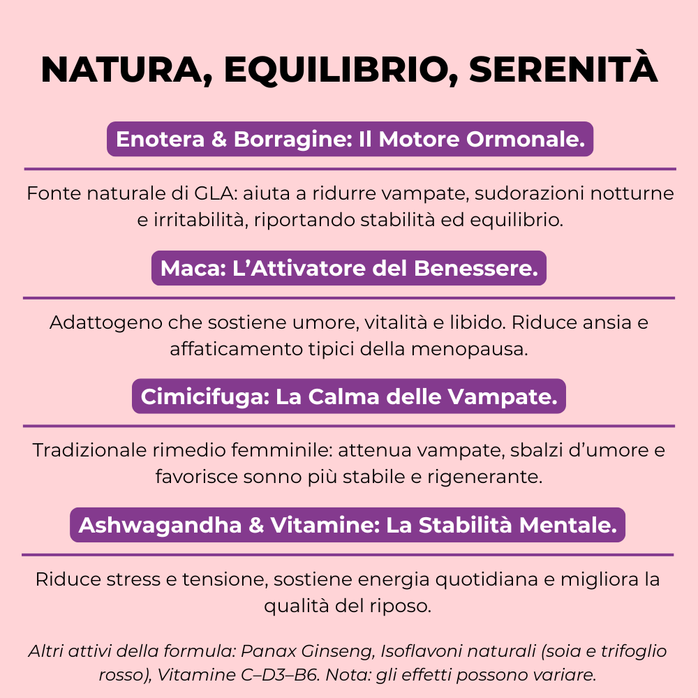 Gli oli di enotera e borragine, ricchi in GLA, supportano la regolazione dei fastidi come vampate e sudorazioni; la maca andina contribuisce alla stabilità dell’umore e della vitalità; l’ashwagandha aiuta a gestire stress e tensione emotiva; i fitoestrogeni naturali agevolano un comfort quotidiano più stabile.