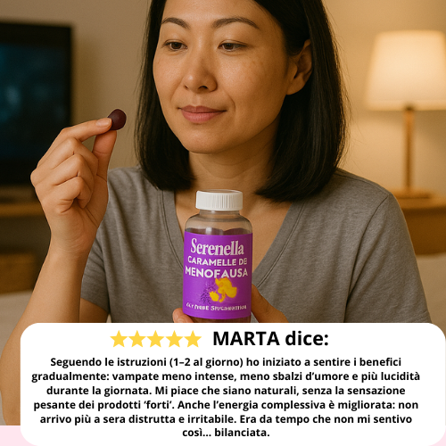 La formula di Serenella Gummies™ rende l’assunzione piacevole e quotidiana, veicolando una sinergia di attivi studiati per il benessere in menopausa: gli oli di enotera e borragine, ricchi in GLA, supportano l’equilibrio ormonale e la termoregolazione; la maca andina favorisce energia e stabilità dell’umore; ashwagandha e ginseng agiscono come adattogeni, aiutando l’organismo a gestire lo stress e la stanchezza. I fitoestrogeni naturali (soia e trifoglio rosso) e le vitamine C, D3 e B6 completano il quadro, sostenendo ossa, sistema immunitario e vitalità.